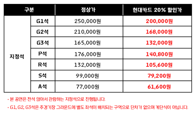 가장 좋은 G1 석이 25만원부터 시작하고, 가장 저렴한 A석은 7만 7천원이고, 현대카드 예매 시 할인 적용되어 G1석은 20만원, A석은 61,600원입니다. A석은 크게 부담 없는 가격으로 보이니 도전 해 볼 만 한 것 같습니다.