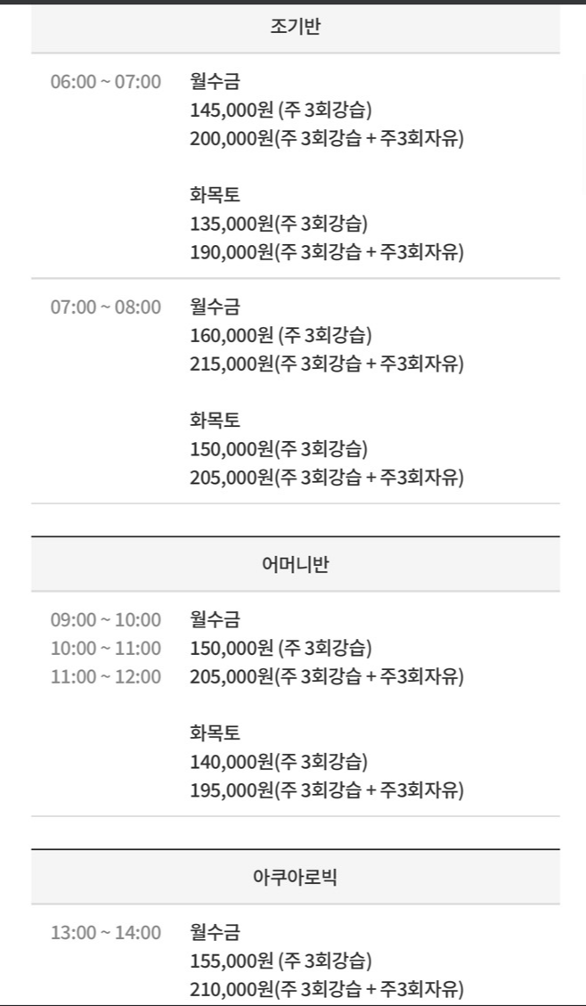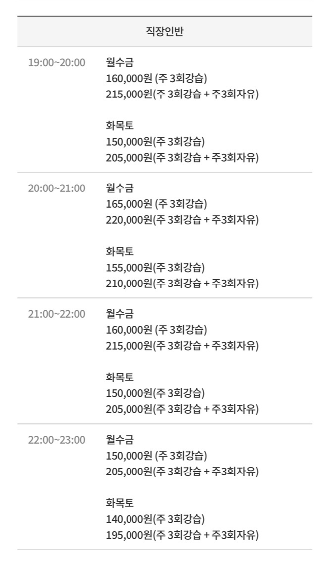 주3일 월수금 180,000원, 화목토 165,000원