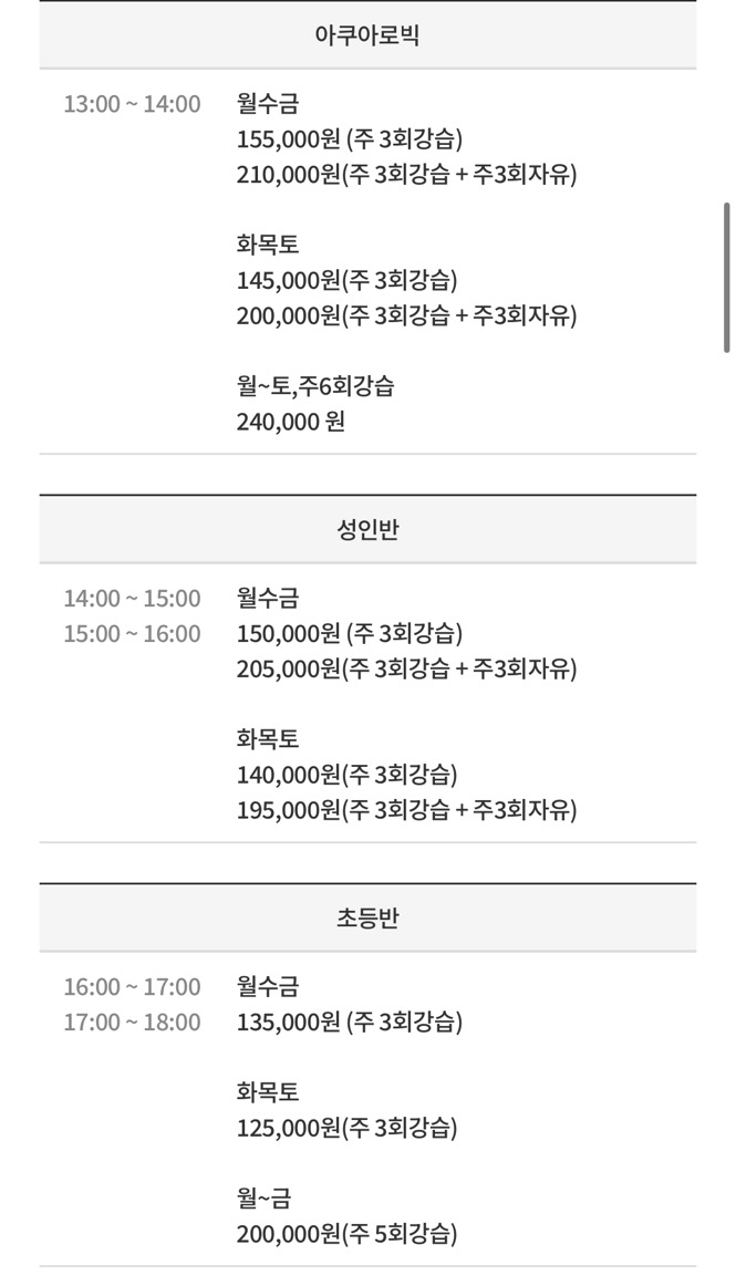 가격대는 주 3회 강습만 신청하면 14~16만원대, 주3회 강습과 주3회 자유수영을 같이 신청하면 19~20만원대입니다.