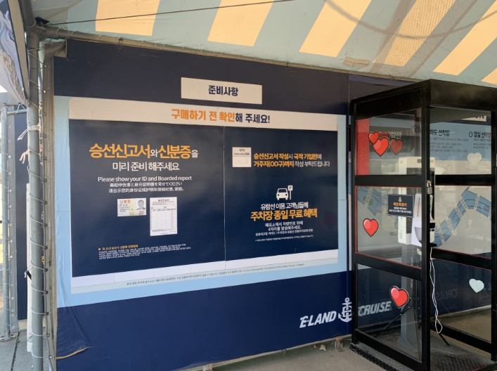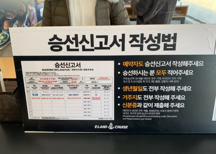 매표소 옆에서 승선신고서를 작성하고 신분증을 제출합니다.