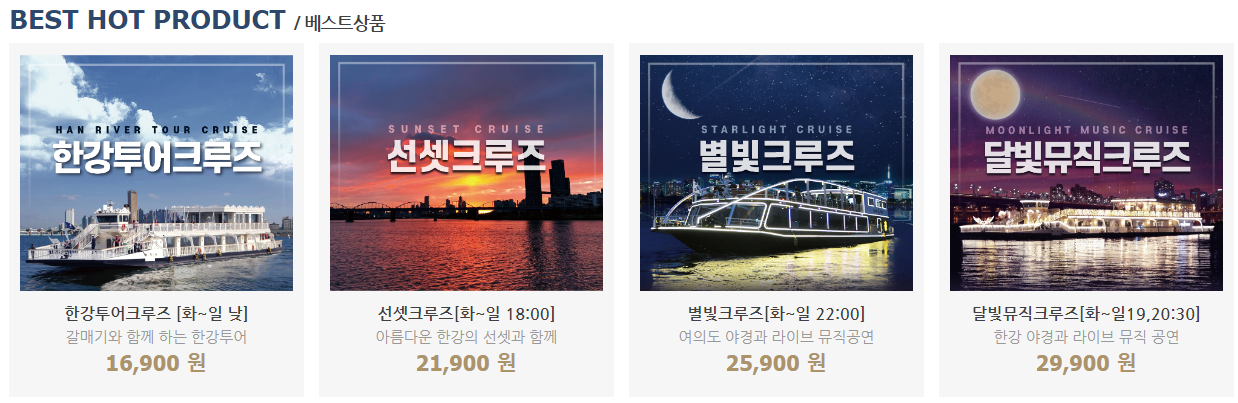현재 운영하고있는 한강 유람선 상품인데요, 낮시간, 선셋, 별빛, 달빛뮤직 이렇게 나뉩니다.